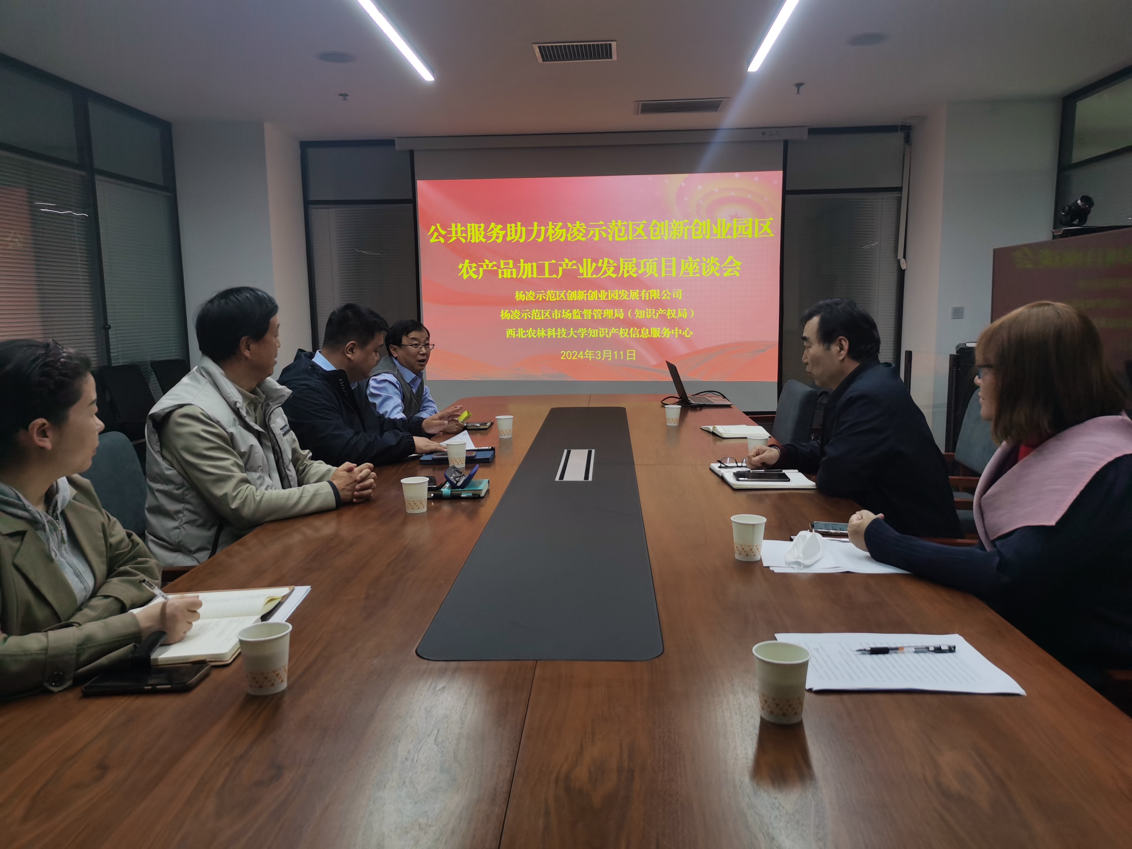为深入贯彻落实国家《知识产权公共服务普惠工程实施方案(2023—2025年)》,推进公共服务助力县域经济发展项目顺利实施,3月11日,杨凌示范区组织召开公共服务助力杨凌示范区创新创业园区农产品加工产业发展项目座谈会。杨凌示范区创新创业园发展有限公司总经理米强、副总经理王博文,西北农林科技大学知识产权信息服务中心主任赵善廷,杨凌示范区市场监督管理局副局长马卜周出席会议。